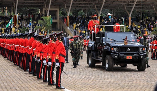 5月12日,穆塞韋尼(右前)在烏干達坎帕拉出席總統(tǒng)就職典禮時檢閱儀仗隊。