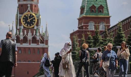 5月23日,人們在俄羅斯首都莫斯科佩戴口罩出行。