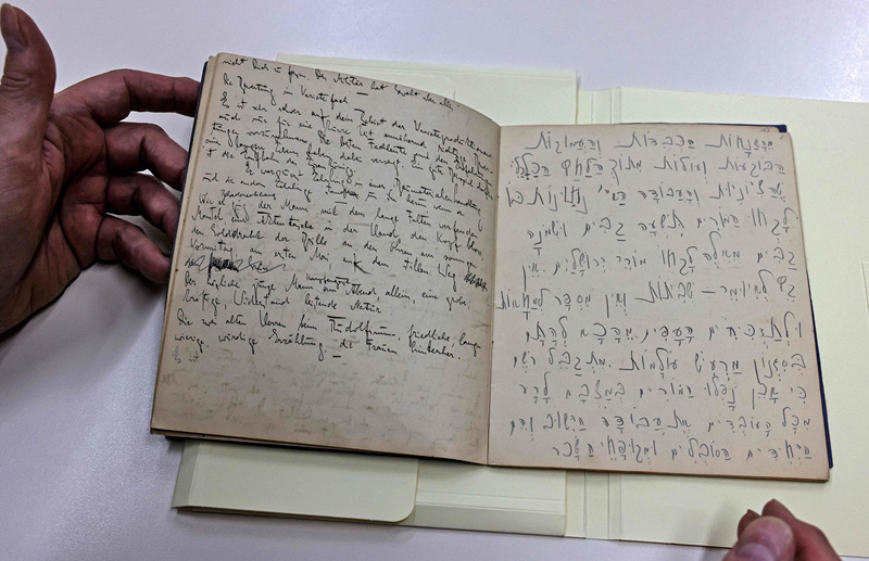 人民網(wǎng)訊 當(dāng)?shù)貢r間5月31日,耶路撒冷地區(qū),以色列國家圖書館的博士修復(fù)并首次展示了捷克德語小說家弗朗茨·卡夫卡用希伯來文(右)和德語(左)所寫的原稿。