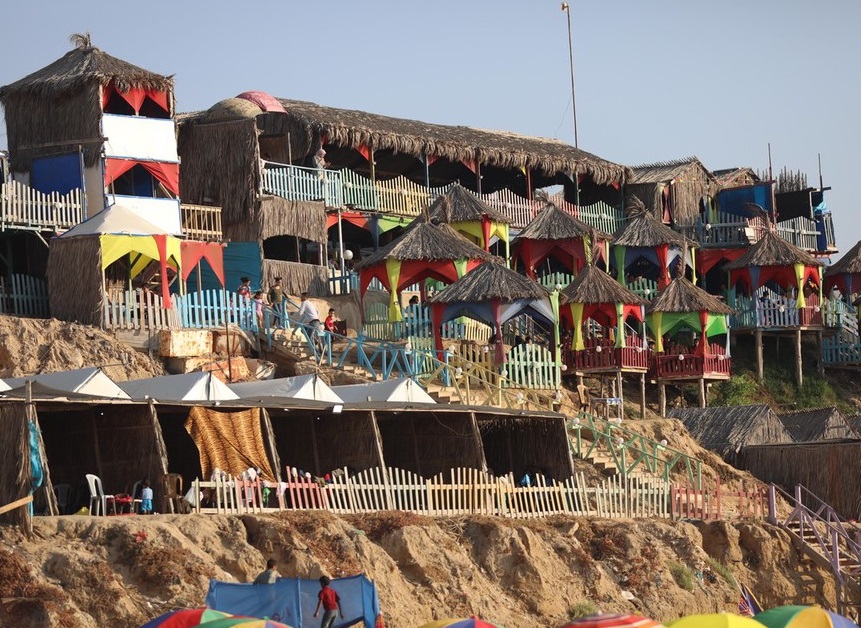 人民網(wǎng)訊 當(dāng)?shù)貢r(shí)間2021年6月25日,巴勒斯坦Deir al-Balah,當(dāng)?shù)鼐用裥∧疚葜懈╊刂泻:?,樂享夏日時(shí)光。海灘是這個(gè)城市為數(shù)不多開放的公共空間之一。