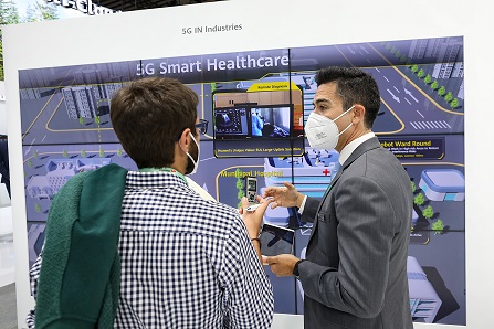 6月28日,在西班牙巴塞羅那,工作人員(右)在世界移動通信大會華為展廳介紹5G技術(shù)與智慧醫(yī)療。