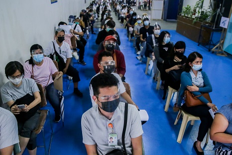 7月27日,在菲律賓圣胡安,人們排隊(duì)等待接種新冠疫苗。