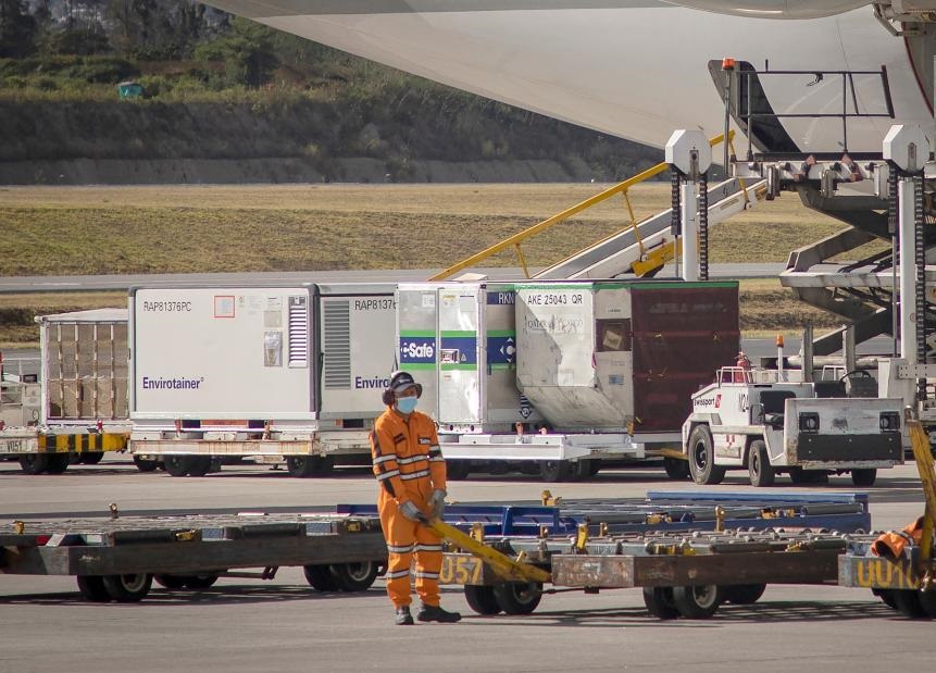 8月3日,工作人員在厄瓜多爾首都基多蘇克雷國際機場轉(zhuǎn)運新冠疫苗。