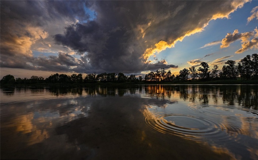 德國夕陽照亮云層 湖面倒映天空美如畫