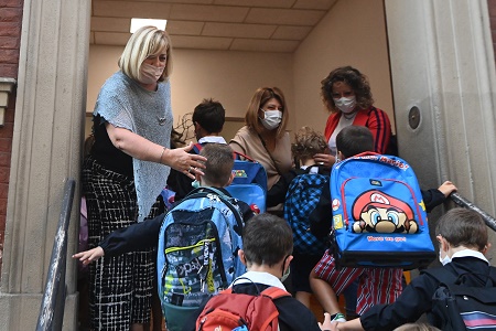 9月13日,學(xué)生在意大利博洛尼亞進(jìn)入學(xué)校。9月13日后,意大利所有大區(qū)學(xué)校將陸續(xù)開學(xué)。根據(jù)意教育部公布的全國學(xué)校防疫措施,教職員工進(jìn)入校園必須持有“綠碼”。