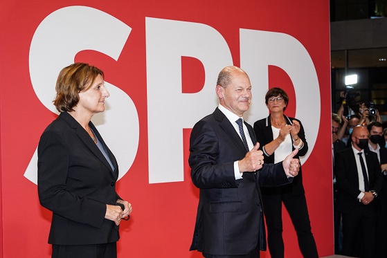 9月26日,在德國(guó)首都柏林的德國(guó)社會(huì)民主黨(社民黨)總部,社民黨總理候選人肖爾茨(中)向支持者致意。