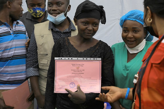 11月4日,在剛果(金)北基伍省貝尼,埃博拉患者在治愈后手持證書準(zhǔn)備出院。