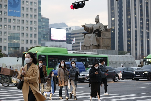 11月29日,行人佩戴口罩在韓國(guó)首爾光化門(mén)廣場(chǎng)過(guò)馬路。