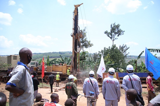 這是10月14日在盧旺達東方省恩戈馬地區(qū)的盧加拉馬村拍攝的中國政府援助盧旺達水井項目的施工現(xiàn)場。