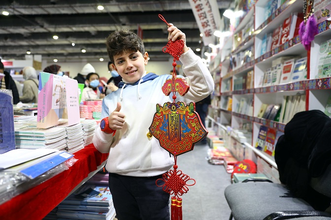 2月4日,在埃及開羅舉辦的開羅國際書展上,一名男孩在中國圖書展位展示春節(jié)裝飾。