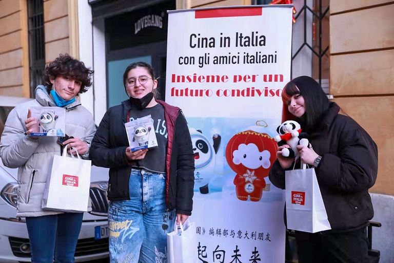 2月13日,電影周觀眾在意大利羅馬的影院門前和“冰墩墩”、“雪容融”合影。