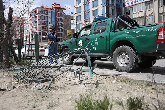 4月20日,警車停在阿富汗喀布爾的一起爆炸事件現(xiàn)場(chǎng)。