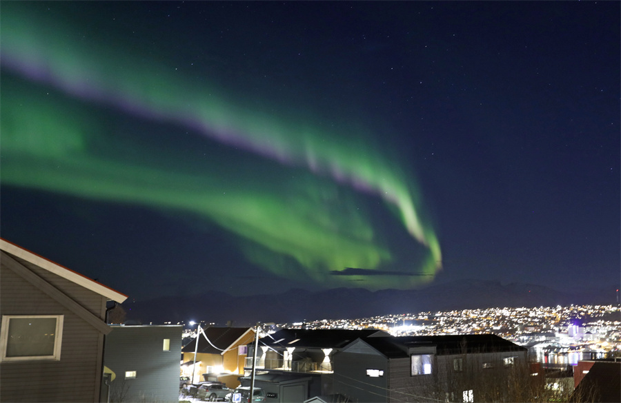當(dāng)?shù)貢r間2022年11月2日,挪威特羅姆瑟,當(dāng)?shù)匾箍宅F(xiàn)唯美北極光。