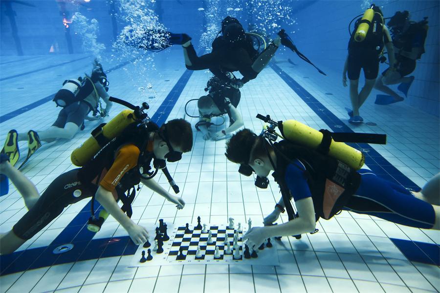 近日,波蘭盧布林的一家潛水服務(wù)公司開設(shè)水下三維象棋課程,參加者在游泳池里上水下三維象棋課。