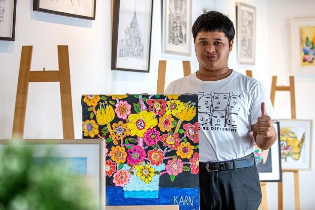 圖為4月2日,在位于曼谷的泰國(guó)孤獨(dú)癥職業(yè)中心,一名孤獨(dú)癥患者展示自己的繪畫(huà)作品。新華社記者 王騰 攝