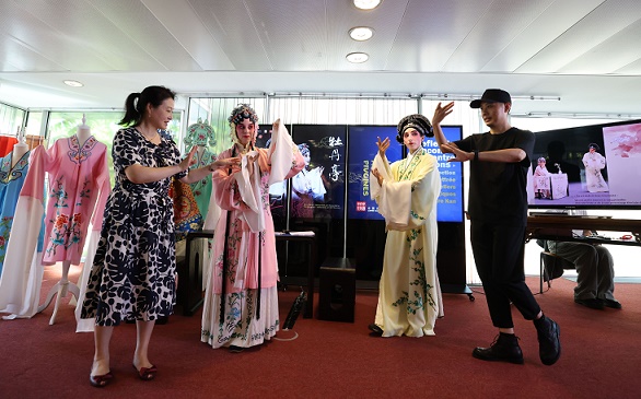 9日,在法國巴黎中國文化中心,江蘇省演藝集團昆劇院院長施夏明(右一)和江蘇省演藝集團昆劇院國家一級演員孔愛萍(左一)為法國觀眾進行念白教學和昆曲扮相體驗。新華社記者 高靜 攝