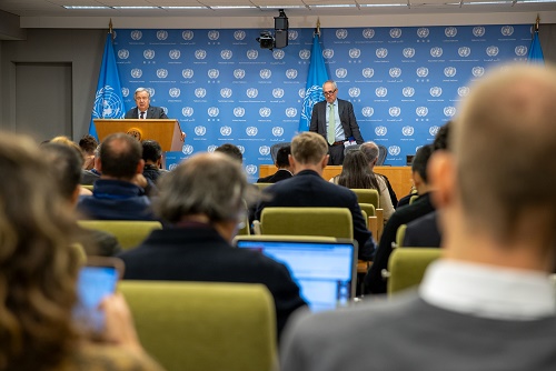 9日,在位于紐約的聯(lián)合國總部,古特雷斯在記者會上就巴以局勢發(fā)表談話。新華社發(fā)(聯(lián)合國供圖/保羅·菲爾蓋拉斯攝)