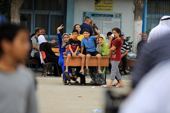 9日,巴勒斯坦人在加沙地帶南部城市汗尤尼斯的一所學(xué)校躲避以色列空襲。新華社發(fā)(亞西爾·庫(kù)迪攝)