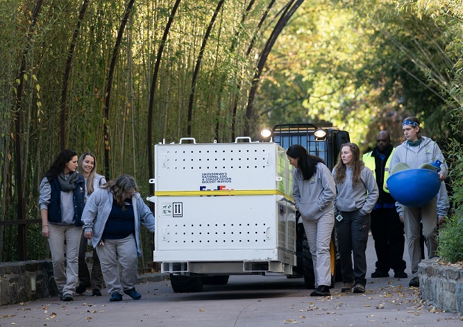 8日,在美國華盛頓史密森學(xué)會國家動物園,裝有大熊貓的箱子準(zhǔn)備被運往機場。新華社記者 劉杰 攝
