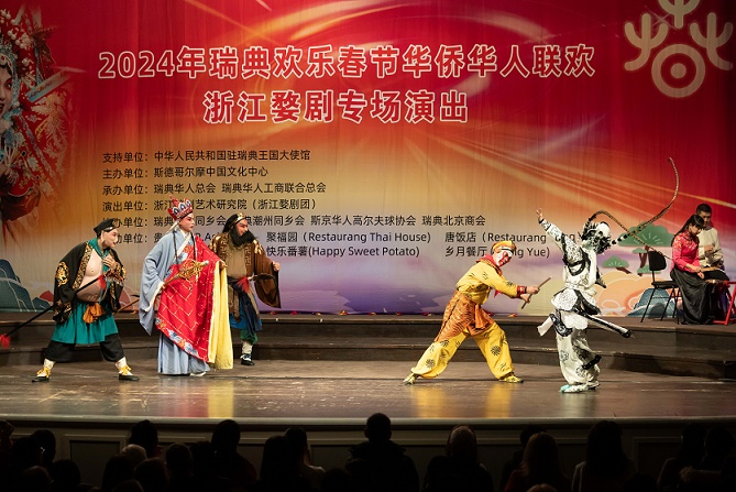 2月2日,瑞典斯德哥爾摩中國文化中心在斯德哥爾摩舉辦活動,通過美食、年畫、彩燈、舞龍和婺劇等多種形式,讓當?shù)孛癖姾腿A僑華人享受了一場“歡樂春節(jié)”的文化大餐。這是演員在活動中表演婺劇。新華社發(fā)(魏學超攝)