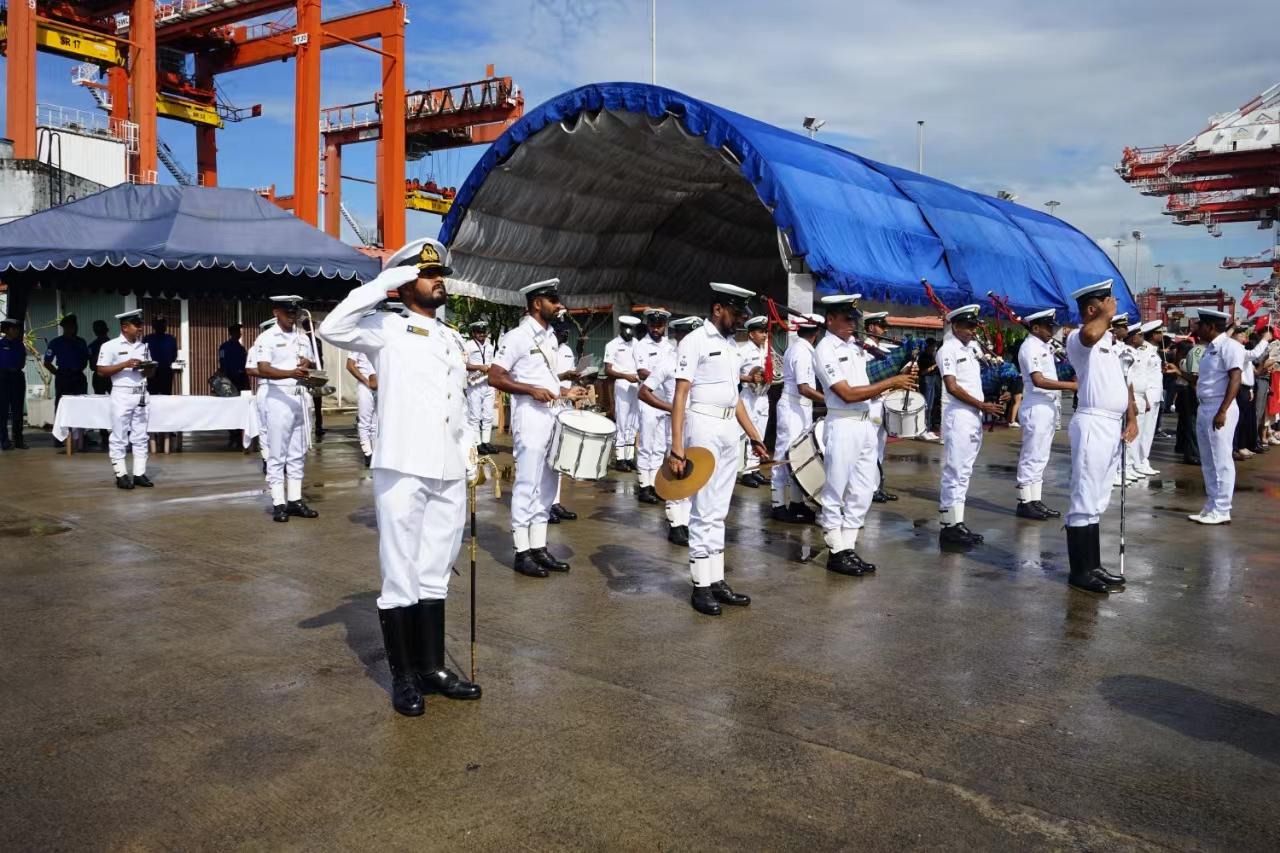 抵港當(dāng)天,斯方在碼頭舉行了歡迎儀式。斯方代表,中國(guó)駐斯里蘭卡大使館工作人員,以及華人華僑和中資機(jī)構(gòu)員工代表等在碼頭迎接。