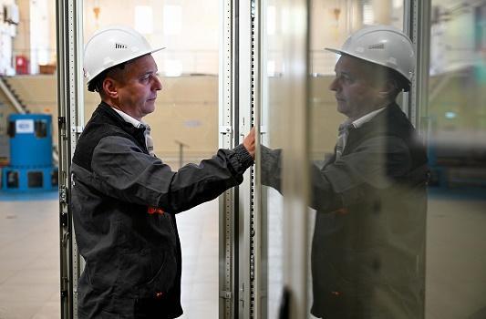5月8日,在哈薩克斯坦東哈州的圖爾古孫水電站,水電站現(xiàn)場調(diào)度員涅波米亞什奇在發(fā)電機(jī)層巡檢水輪發(fā)電機(jī)組運(yùn)行狀態(tài)。新華社記者 李任滋 攝