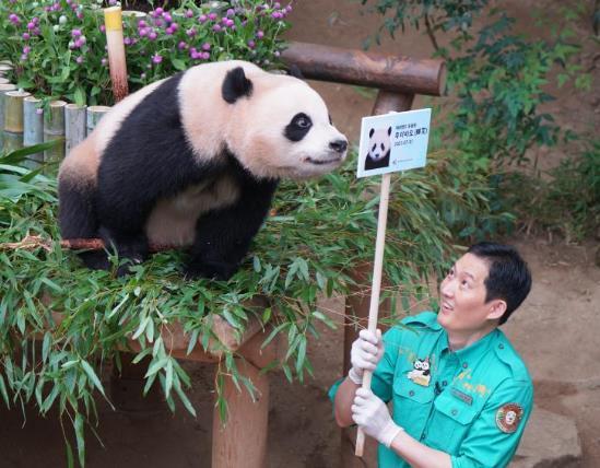 7月7日,在韓國京畿道龍仁市愛寶樂園,大熊貓“睿寶”與飼養(yǎng)員姜哲遠互動。新華社發(fā)(孫一然攝)