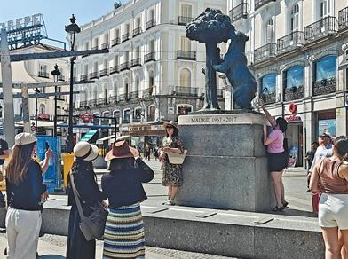 今年夏季,大批中國游客到訪西班牙馬德里。圖為近日,中國游客與馬德里標(biāo)志性雕塑——熊與樹莓合影。人民日報記者 許海林?jǐn)z