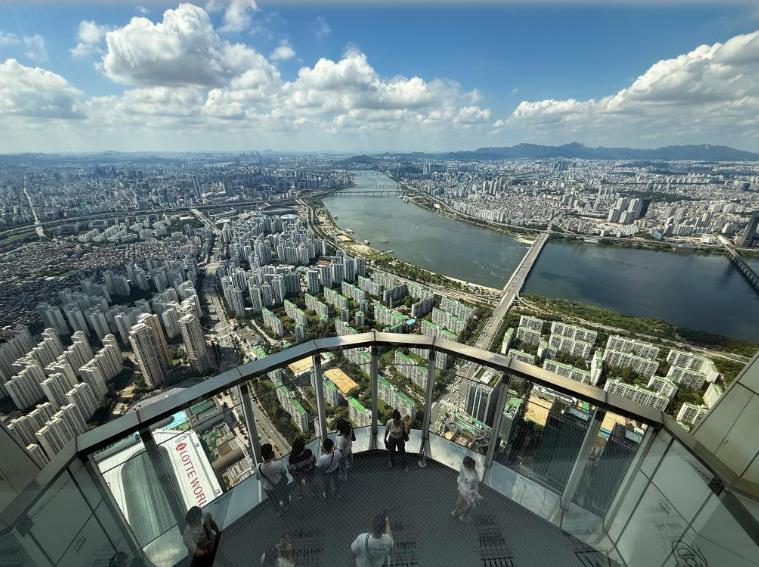 9月5日,游客在首爾的樂(lè)天世界塔高層展望臺(tái)拍照。新華社發(fā)(全休相攝)