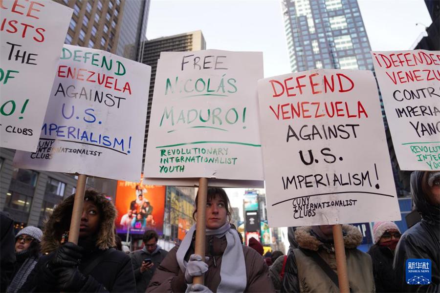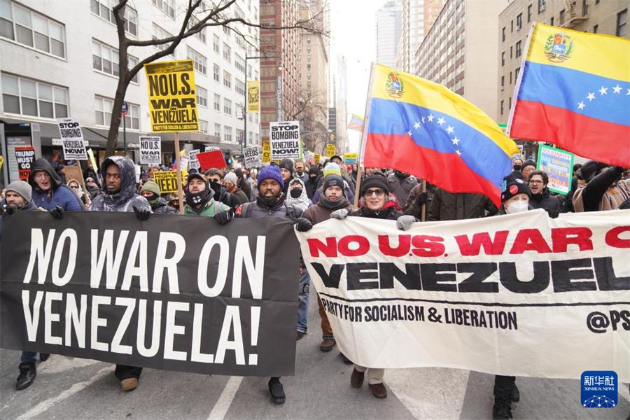 1月3日,近千名民眾在美國(guó)紐約舉行集會(huì)游行,抗議美國(guó)對(duì)委內(nèi)瑞拉實(shí)施軍事打擊。