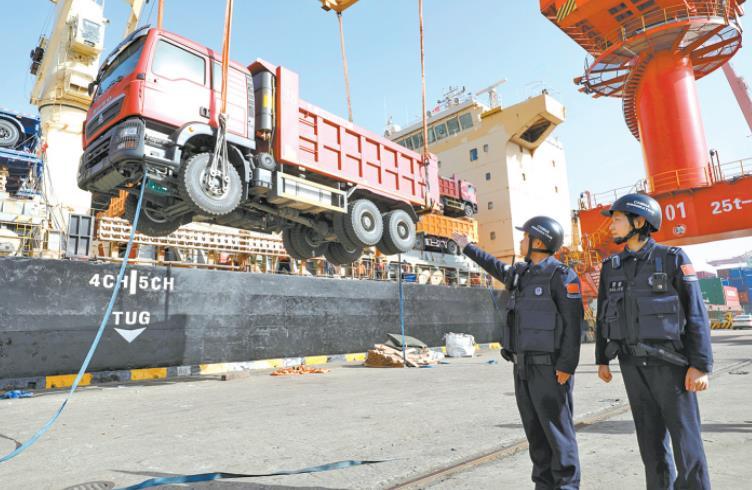 2025年11月28日,江蘇省張家港港務(wù)集團(tuán)有限公司碼頭一片忙碌,貨輪停在泊位上有序裝載385輛“中國制造”工程車,準(zhǔn)備駛往“一帶一路”共建國家肯尼亞。 CFP供圖