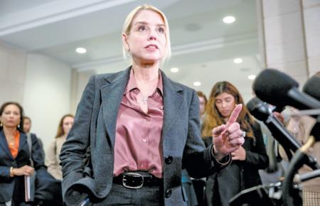 當(dāng)?shù)貢r(shí)間3月18日,美國(guó)司法部長(zhǎng)帕姆·邦迪在國(guó)會(huì)山向眾議院監(jiān)督與政府改革委員會(huì)成員通報(bào)對(duì)愛潑斯坦案的調(diào)查情況后,與記者交談。 CFP供圖