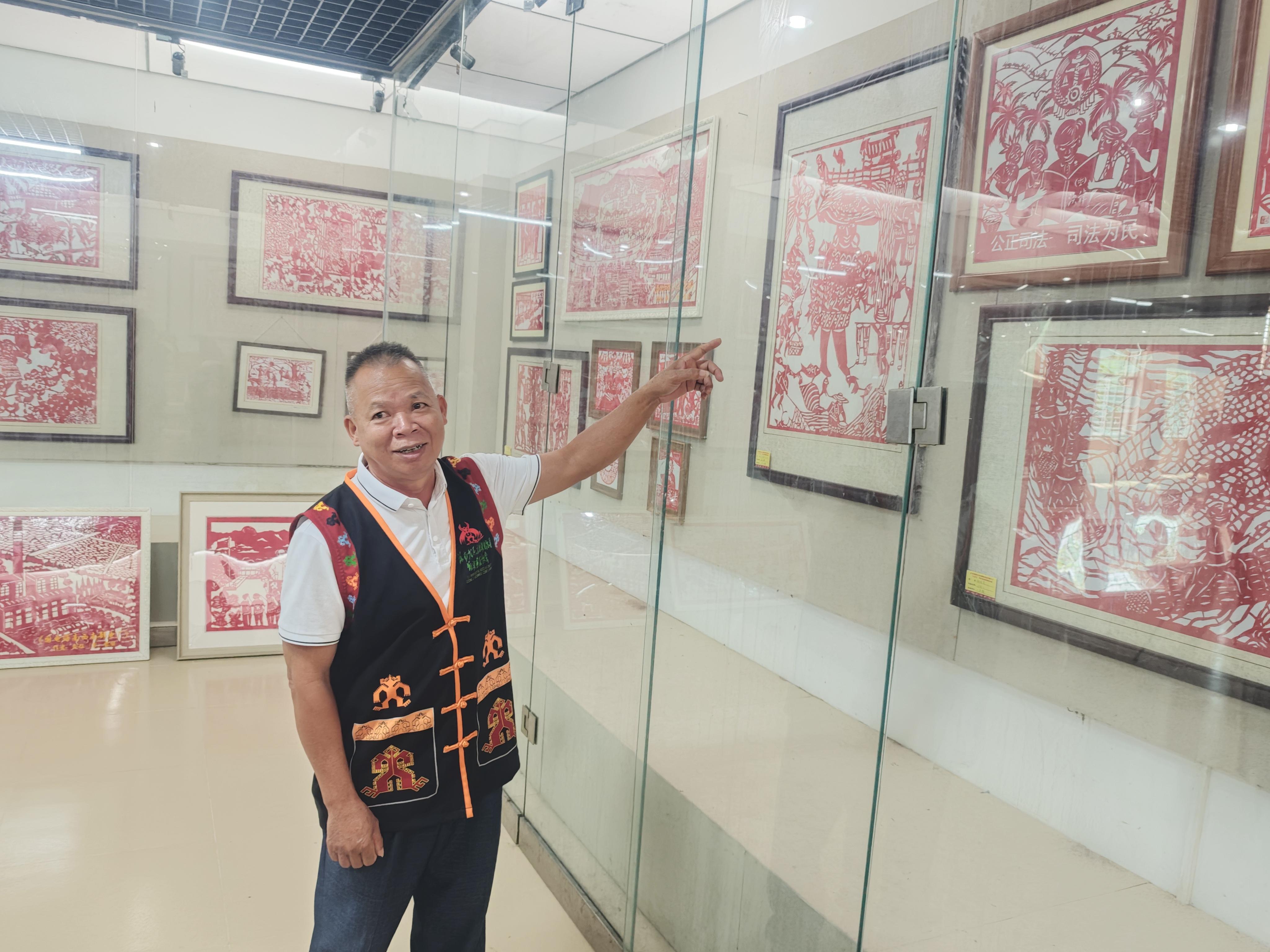 “剪紙以前大多是剪一些吉祥圖案、民族傳說。在縣司法局的指導(dǎo)下,我開始嘗試將法治元素融入剪紙藝術(shù),創(chuàng)作大量的法治題材剪紙作品?!贝蟀布艏埣妓囀〖墏鞒腥肆治纳硎?,他積極參與法治剪紙進校園、進鄉(xiāng)村等普法宣傳活動,讓學生和黎族村民在欣賞精美剪紙的同時,接受法治文化的熏陶。