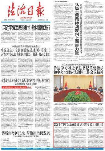 本報北京11月27日訊 記者蔡長春 今年12月4日是第十二個國家憲法日。日前,中央宣傳部、司法部、全國普法辦聯(lián)合印發(fā)通知,以“學(xué)習(xí)宣傳貫徹習(xí)近平法治思想,推動憲法深入人心”為主題,在全國組織開展2025年“憲法宣傳周”活動。