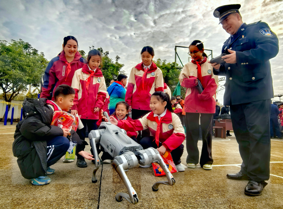 活動特別注重法治精神與職業(yè)榮譽的傳承。全國公安系統(tǒng)二級英雄模范、來賓北站派出所所長蘇亞偉結(jié)合自身經(jīng)歷,講述從警故事與忠誠使命,激發(fā)同學(xué)們的愛國情懷與法治意識?,F(xiàn)場,功勛警犬“阿布”的精準(zhǔn)搜爆與警用四足機器人的智能巡查同臺演示,詮釋了傳統(tǒng)警務(wù)技能與現(xiàn)代科技應(yīng)用在法治軌道上的深度融合,展現(xiàn)了公安機關(guān)向科技要警力、發(fā)展新質(zhì)戰(zhàn)斗力的探索。