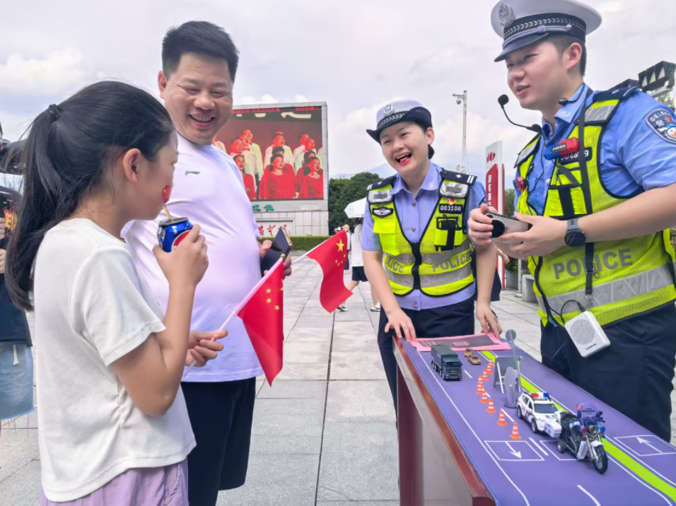 2025年國(guó)慶假期,來(lái)自湖南的游客王先生一家被“高速公路安全桌盤講解區(qū)”吸引,民警用沙盤模擬高速爆胎、發(fā)生事故等場(chǎng)景,手把手教他如何正確放置三角警示牌?!霸疽蚨萝囆那楹軣┰?,沒想到還能學(xué)到安全技能,井岡山的高速交警太有心了。”王先生連連稱贊。