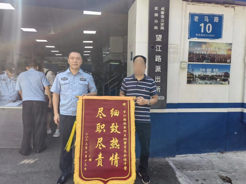 “謝謝警察同志,這么快就幫我把手機(jī)找回來了!”近日,方先生將一面印有“細(xì)致熱情 盡職盡責(zé)”的錦旗送到了望江路派出所教導(dǎo)員彭偉手中,對(duì)派出所民警快速為其追回手機(jī)表示誠(chéng)摯感謝。