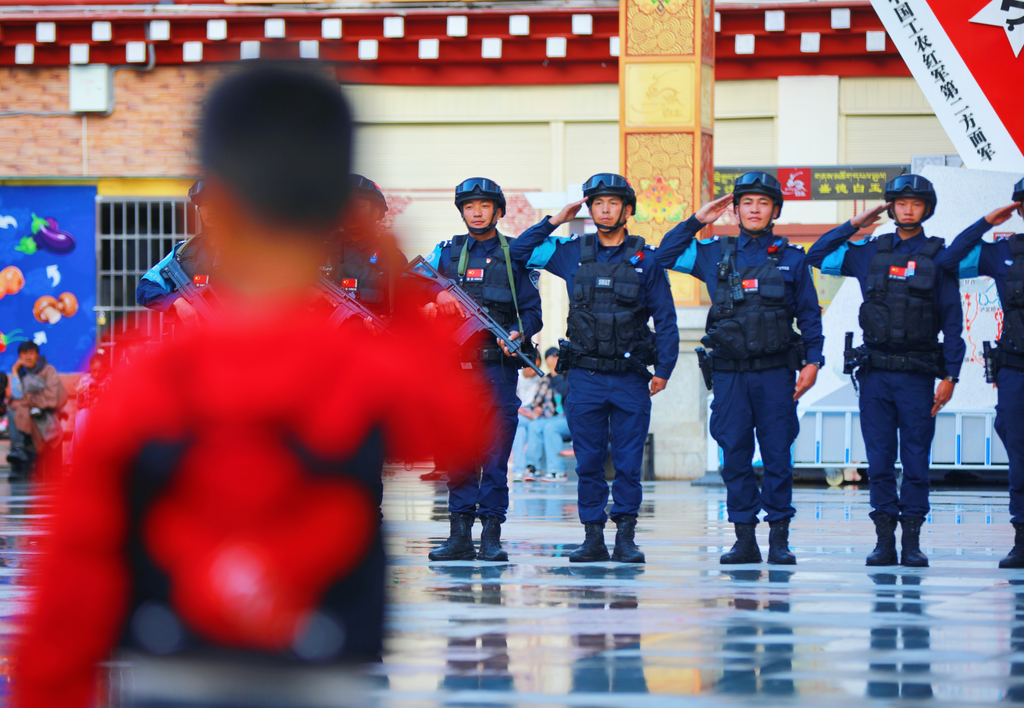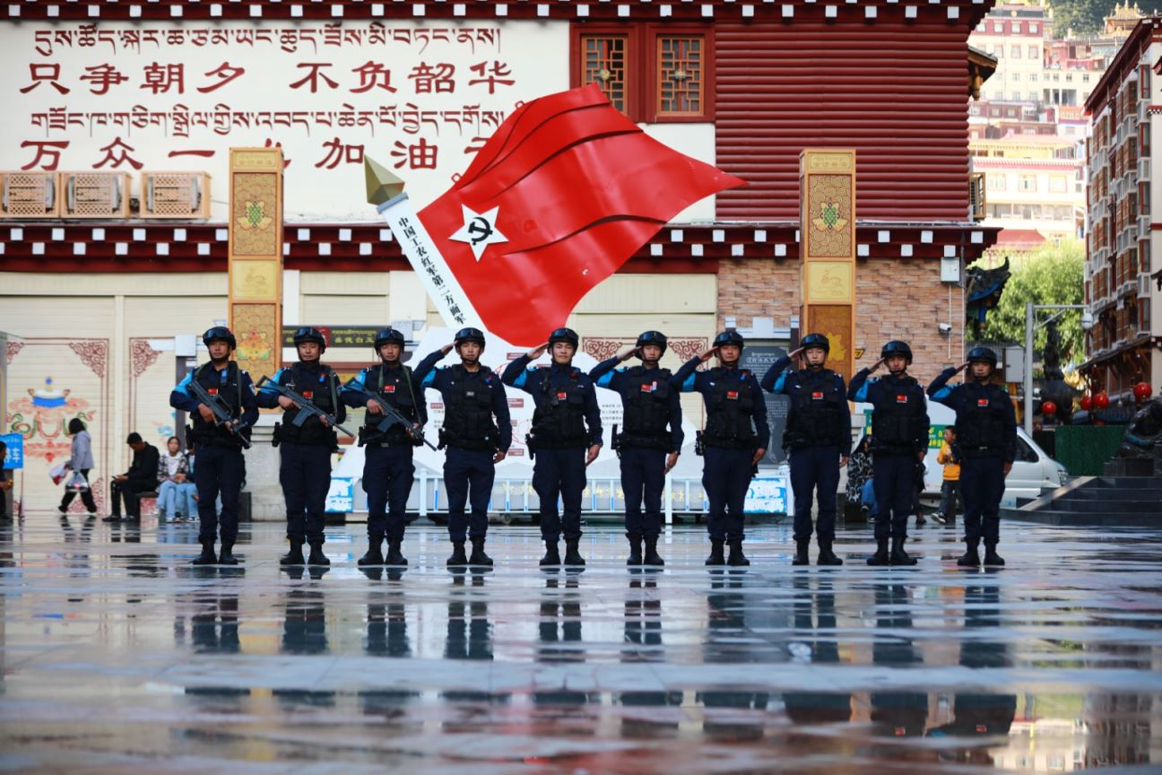一個(gè)敬榜樣,一個(gè)敬未來。9月26日18時(shí)許,雨后的四川省甘孜藏族自治州白玉縣市政廣場(chǎng),5歲萌娃澤稱巴登對(duì)白玉縣公安局特巡警大隊(duì)巡邏執(zhí)勤民輔警敬禮,獲得了10名警察叔叔整齊列隊(duì)回敬。