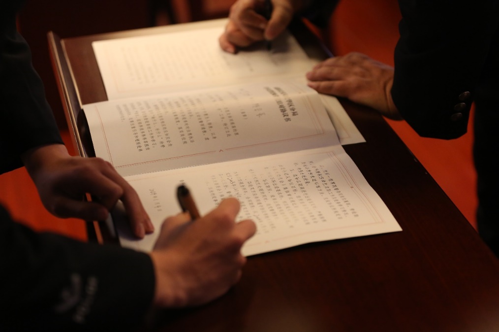 兩對師徒代表依次上臺簽訂《青年民警優(yōu)師帶徒結(jié)對協(xié)議書》,兩對師徒代表依次上臺作了表態(tài)發(fā)言。