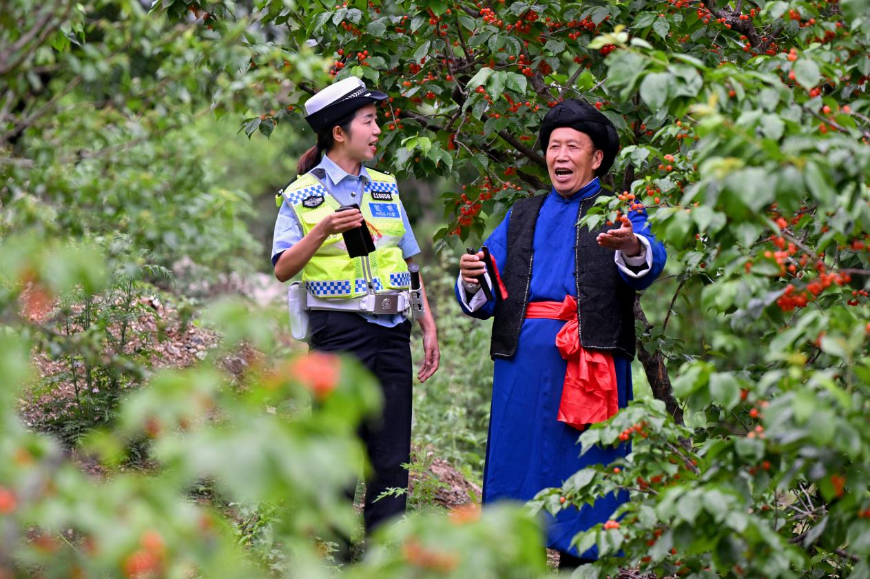 “所有開車駕駛員,自我告誡重三件。發(fā)動車輛開車前,重要部位查一遍。發(fā)動車輛開車前,排除隱患保安全。所有開車駕駛員,發(fā)動車輛開車前,系安全帶要規(guī)范。安全行駛最重要,平平安安回家園。”4月25日下午,正值2024年瀘定紅櫻桃采摘體驗(yàn)季推薦會在四川省甘孜州瀘定縣冷磧鎮(zhèn)杵坭櫻桃谷即將開幕之際,在果實(shí)累累的杵坭村櫻桃樹下,有“微笑交警”之譽(yù)的劉格蘆會同省級非物質(zhì)文化遺產(chǎn)瀘定山歌傳承人吳全清老人,冒著細(xì)雨一道錄制《開車自我告誡重三件》快板說唱視頻,用于在線上“平安甘孜”傳播護(hù)航五一小長假。