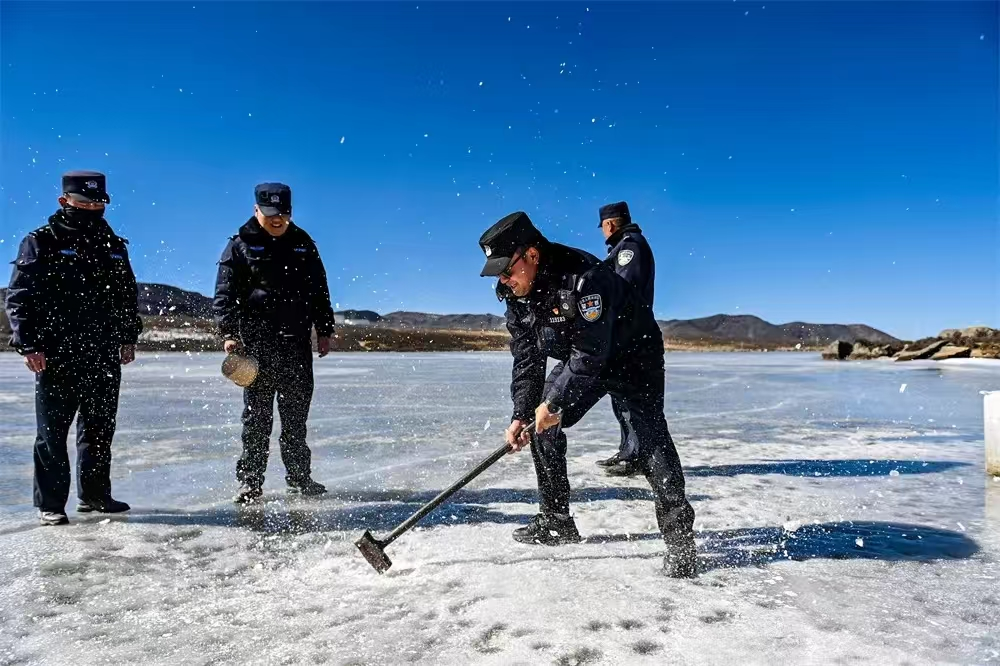 中午時分,土登郎加又和大家一起前往警務站不遠處的措拉湖里取水,警務站不通水,大家的生活用水都是從這個海子里提取的。每到冬季,海子的水面就會結冰,堅固的冰面能夠通行汽車。只有到了中午,氣溫開始回升,冰層融化了一些,大家找到結冰薄一點的地方,使勁用鐵錘鑿開一個窟窿,才能取到冰面下的水。