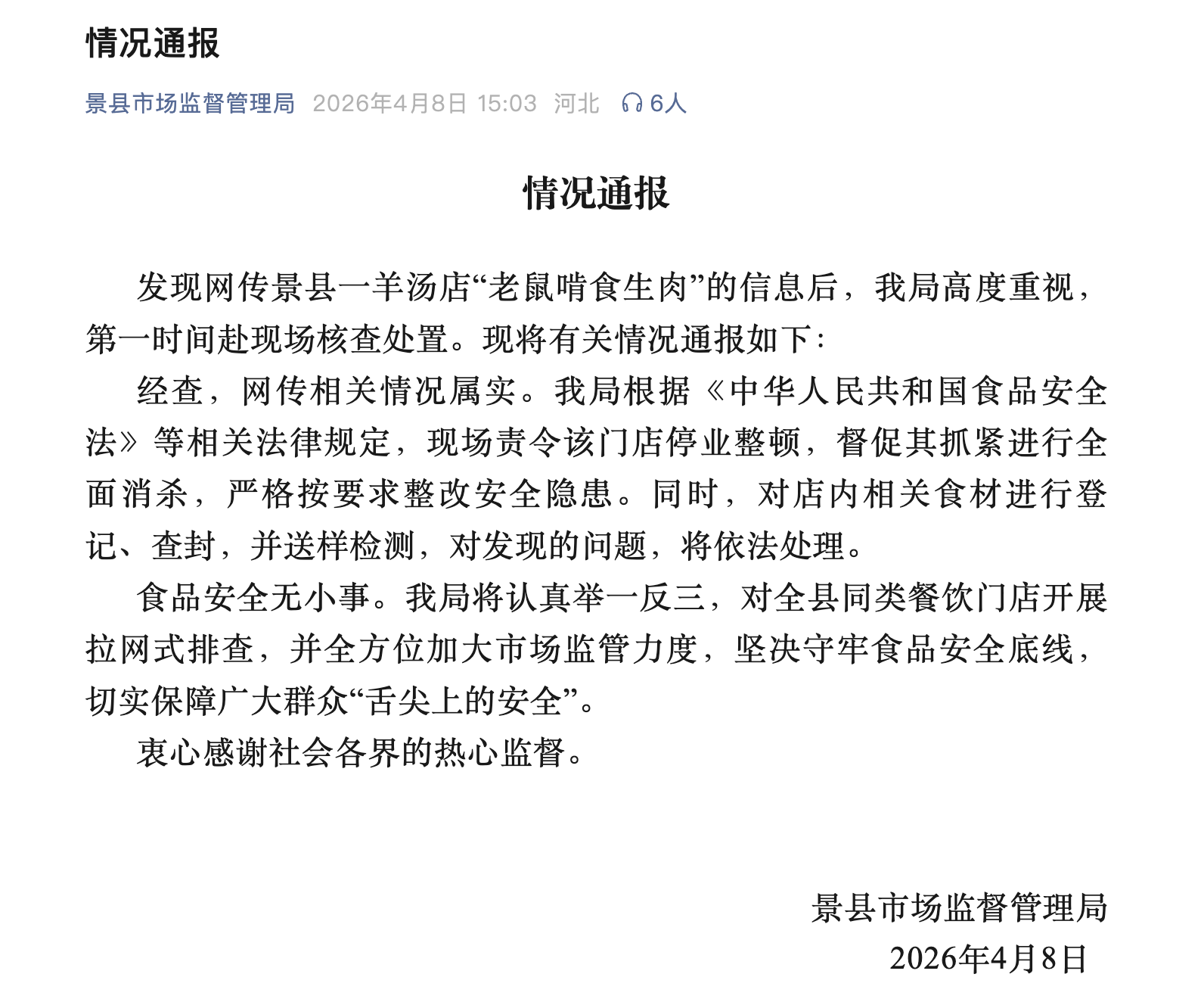 4月8日,景縣市場監(jiān)督管理局發(fā)布情況通報稱,發(fā)現(xiàn)網(wǎng)傳景縣一羊湯店“老鼠啃食生肉”的信息后,該局高度重視,第一時間赴現(xiàn)場核查處置?,F(xiàn)將有關(guān)情況通報如下:
