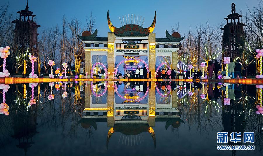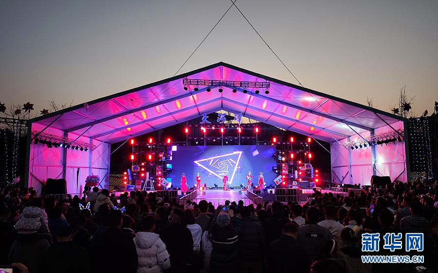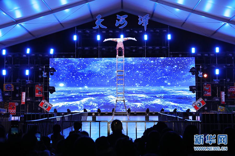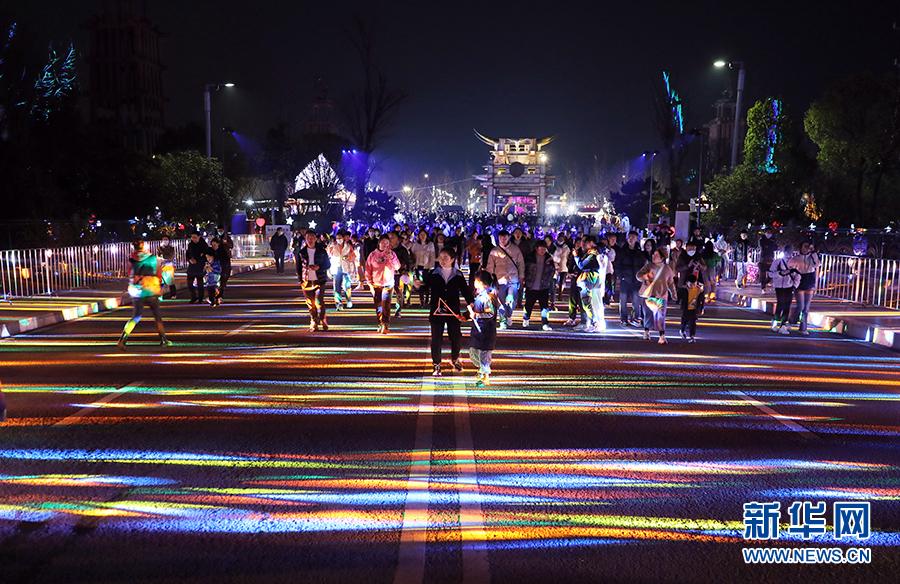 1月31日晚,天河潭景區(qū)廣場上舉行走秀、歌舞、雜技等舞臺演藝。新華網 盧志佳 攝