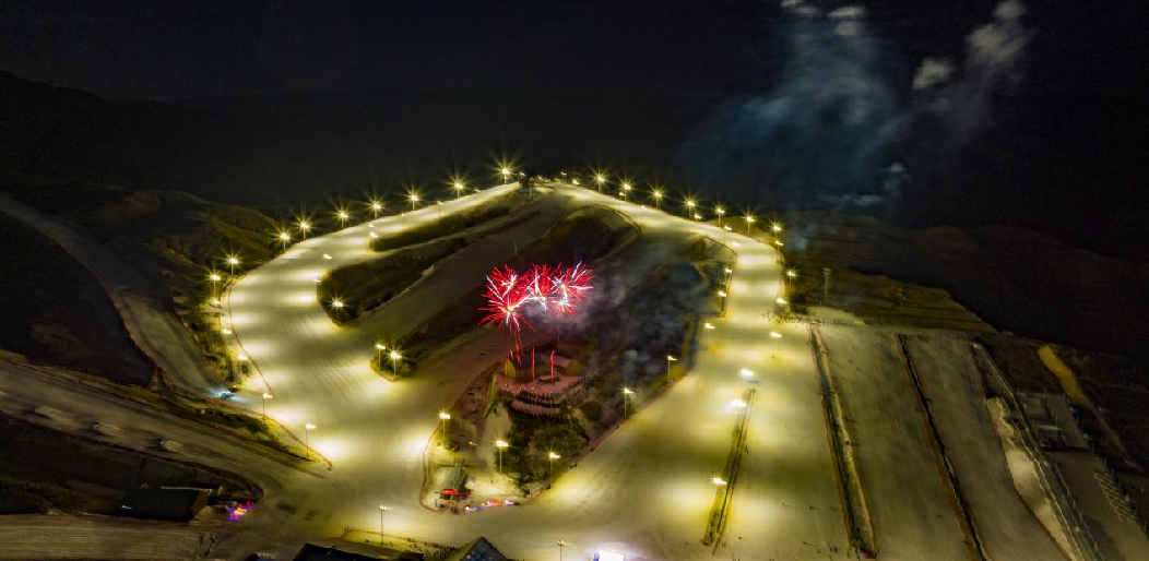 2月5日,馬鬃山滑雪場上演大型雪地?zé)熁ㄐ?,吸引了大量游客觀看。(無人機(jī)照片)新華網(wǎng)發(fā)(樂炎 攝)