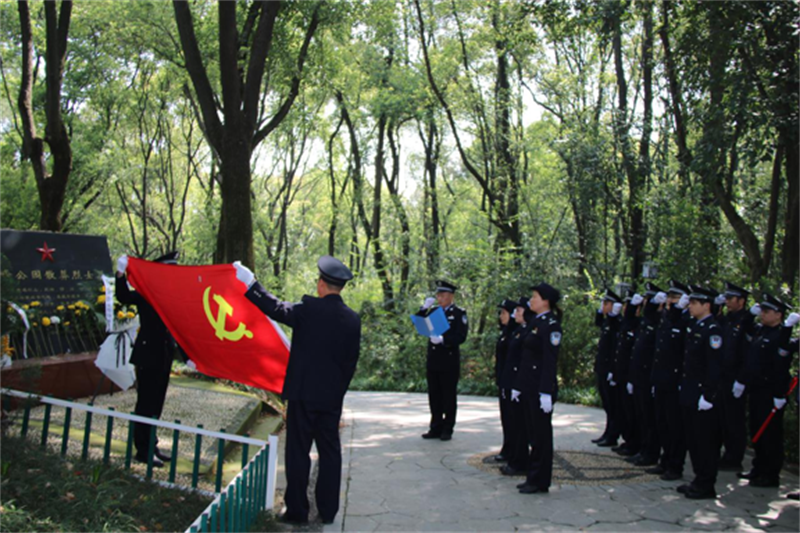 上午10時許,祭掃儀式開始。全體民輔警整裝列隊,肅立烈士墓碑前,在莊嚴肅穆的氛圍中,王永生、杜杰同志緩步上前,向烈士墓碑及長眠在此的革命先烈敬獻花籃并為花籃梳理挽聯(lián)。隨后,全體人員脫帽肅立默哀,并向革命烈士敬獻鮮花。最后,面對莊嚴的黨旗,全體人員舉起右手重溫了入黨誓詞,表達了對黨的赤誠之心。