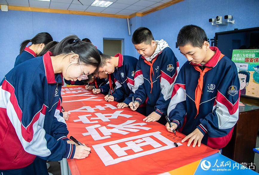 4月12日,內(nèi)蒙古呼和浩特市第二十六中學學生在“國家安全 人人有責”宣傳條幅上簽名。丁根厚 攝