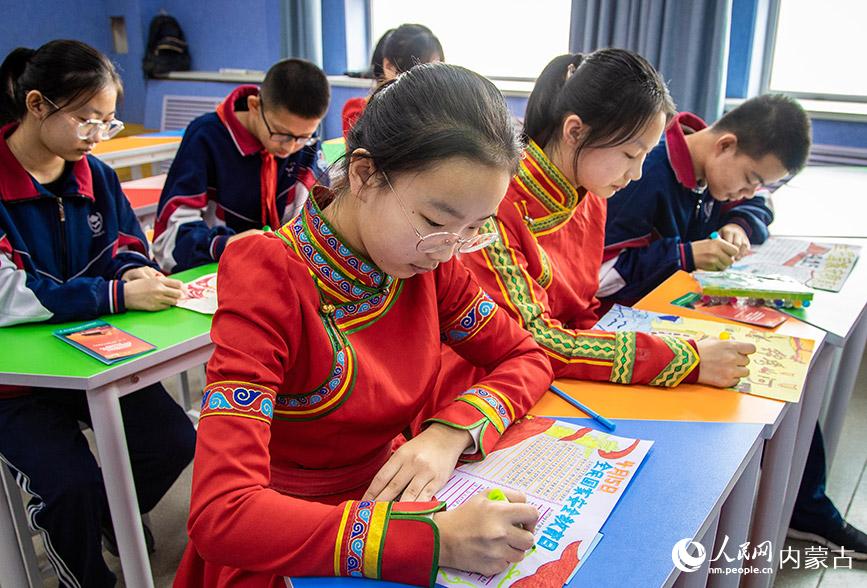 4月12日,內(nèi)蒙古呼和浩特市第二十六中學學生在繪制國家安全教育主題手抄報。丁根厚 攝