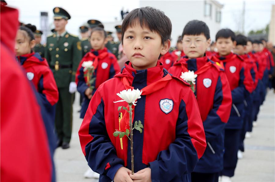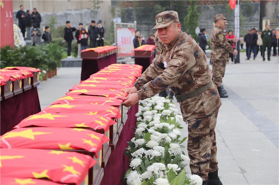 安葬儀式現(xiàn)場奏唱國歌,莊嚴肅穆,隨后逐一介紹集中安葬的60名烈士生平。全體人員脫帽,向革命烈士紀念碑和革命烈士默哀三分鐘。固鎮(zhèn)縣委相關負責同志宣讀祭文,現(xiàn)場三鞠躬后,人武專干、烈士親屬將烈士骨灰護送至墓穴安葬。參加活動人員依次向烈士獻花。