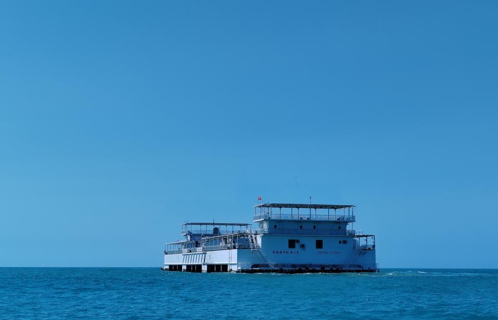 從海南省樂東黎族自治縣龍棲灣向外約8海里,可以看到“普盛海洋牧場3號”如同一艘白色郵輪泊在蔚藍(lán)色的大海之中。