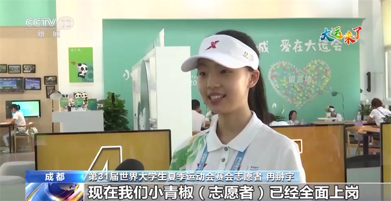 第31屆世界大學生夏季運動會賽會志愿者 冉翀宇:現(xiàn)在我們小青椒(志愿者)已經(jīng)全面上崗,我們將以熱情周到、專業(yè)高效的志愿服務,與全球青年一起共享這場體育盛會,助力成都大運會的順利舉辦。